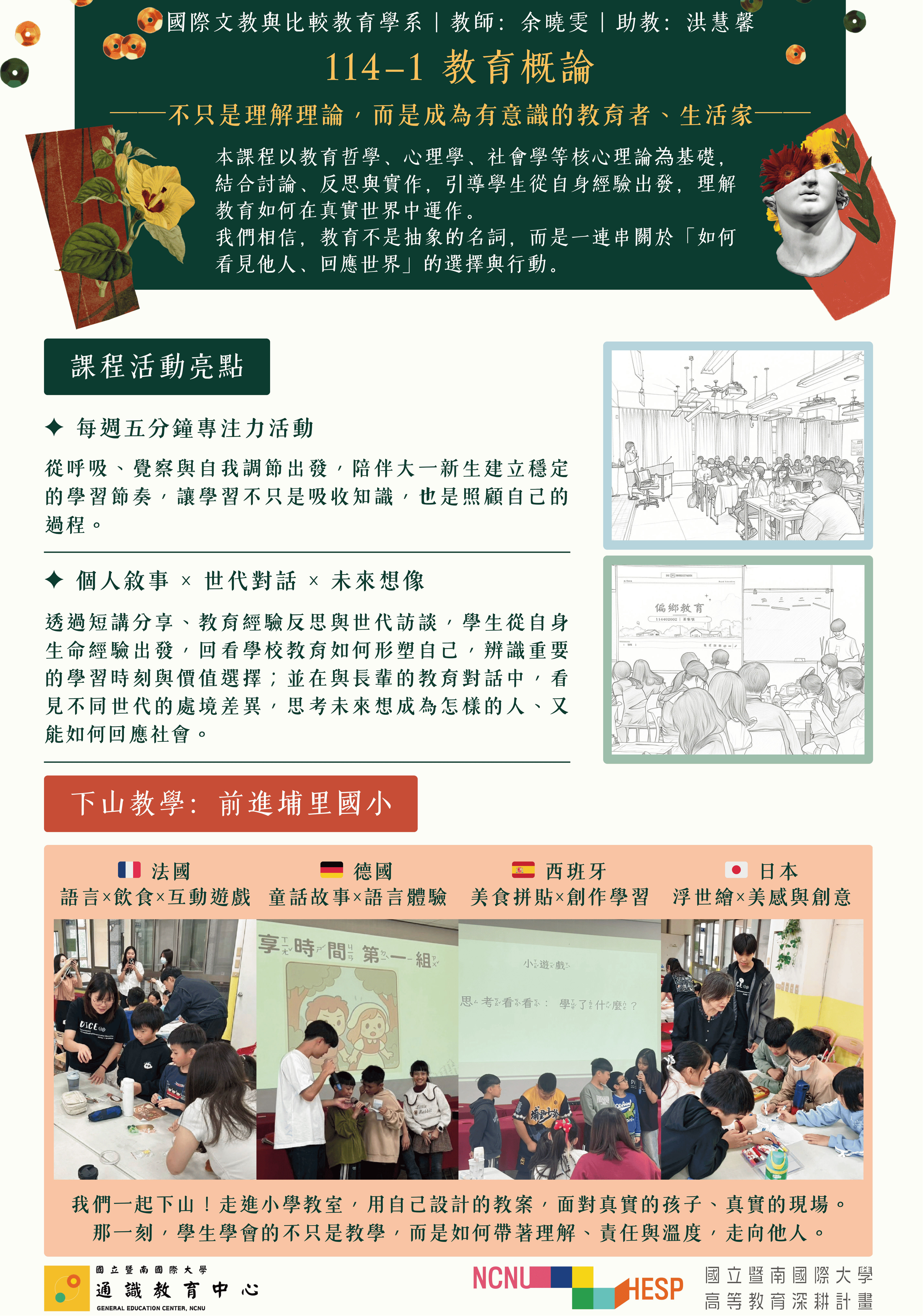 | 課程簡介:課程後期安排下山教學實作,前往埔里國小進行三年級「各國文化」主題教學。學生依語文組別分組,結合課堂所學自行設計教案並進行試教。教學後透過互評、成果紀錄與檢討會,引導學生回顧教學歷程,完成由理論理解到實踐反思的學習循環。 | ||