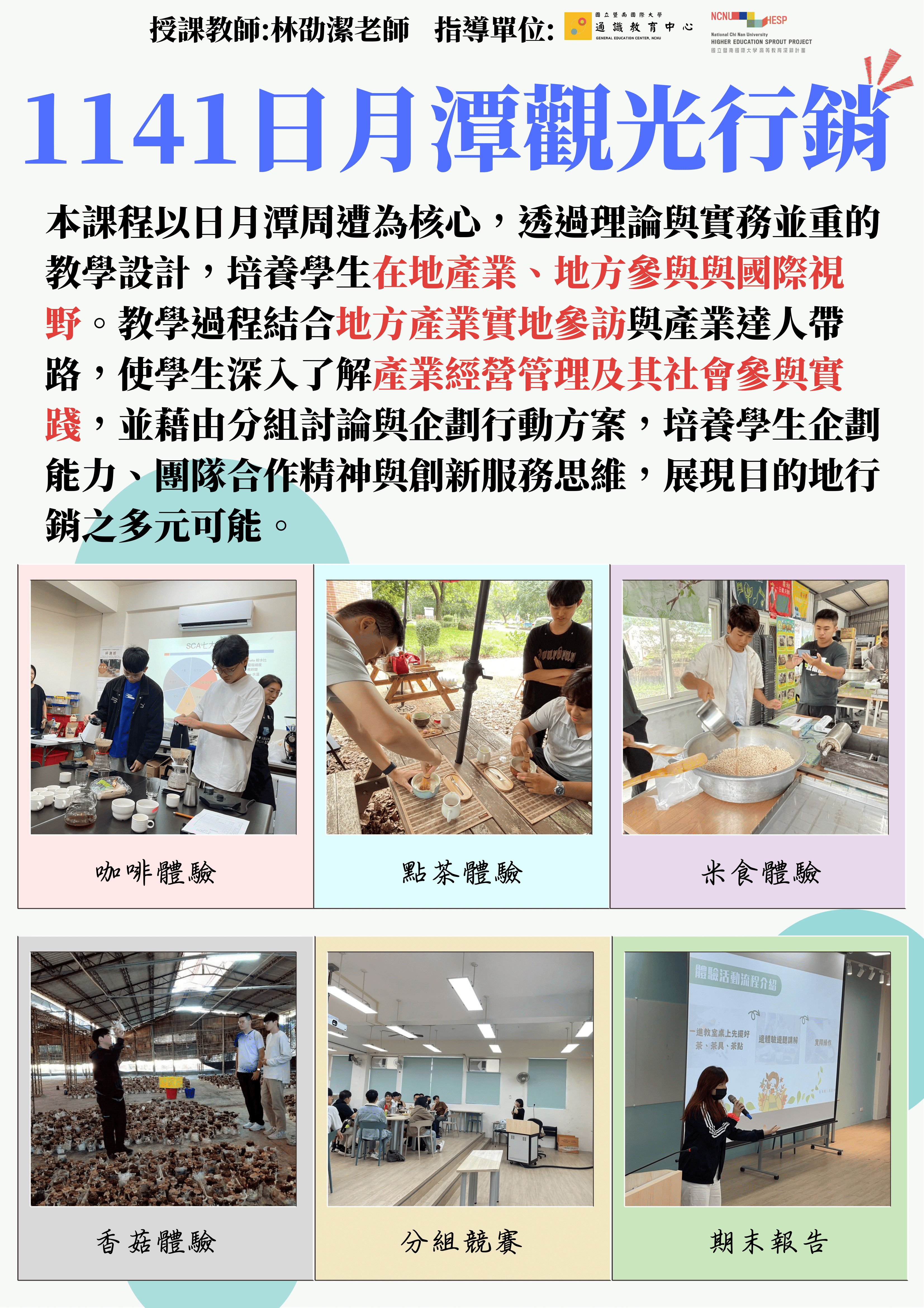 | 課程簡介:本課程以日月潭為學習場域,結合理論與實務,帶領學生認識地方產業、觀光行銷與永續發展的關係。透過理論學習、實地參訪與企劃實作,培養學生的企劃能力、跨域整合思維與團隊合作精神,並發展具在地特色與可行性的目的地行銷方案。 | ||
