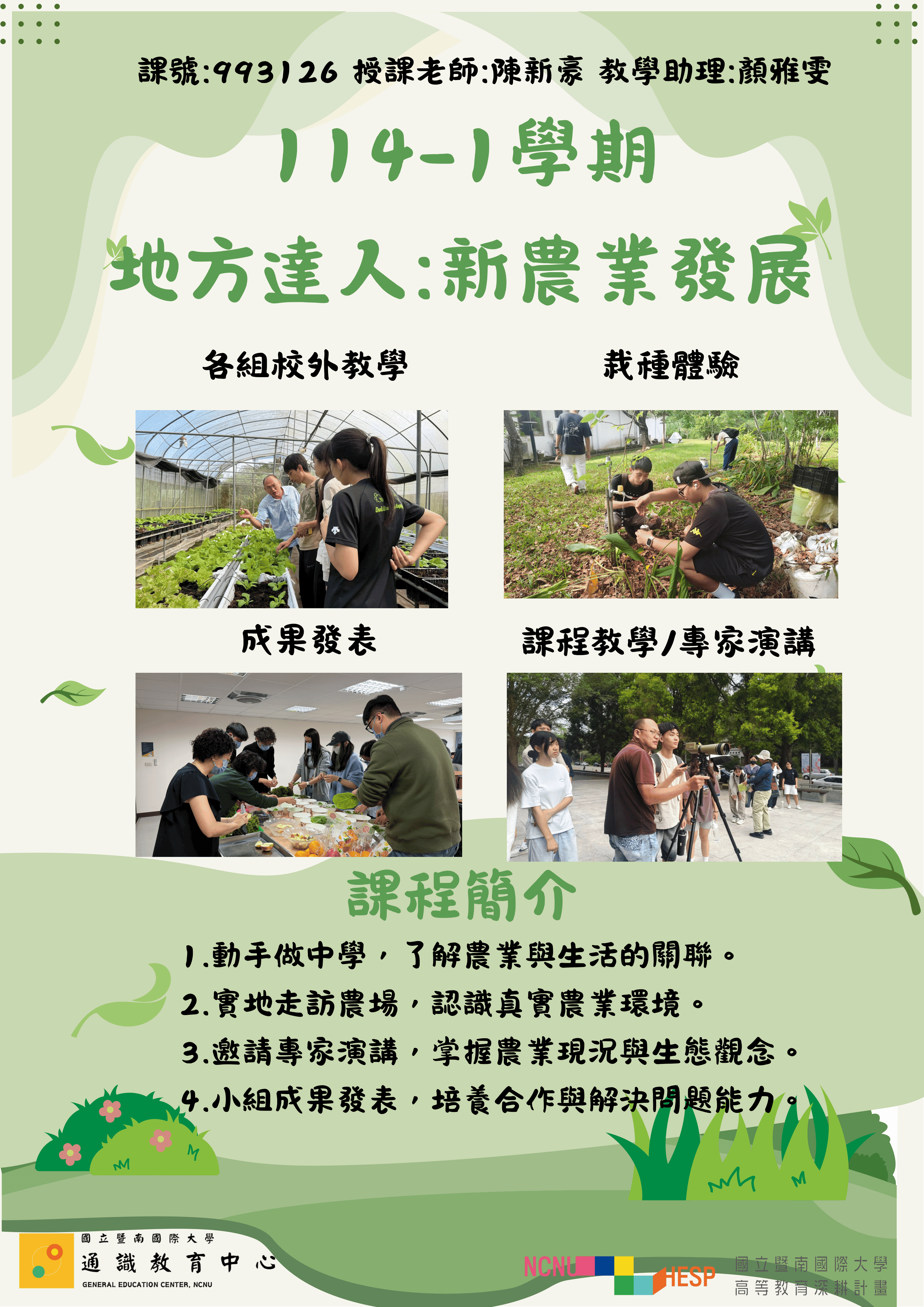 | 課程簡介:本課程透過多元主題分組實地學習,涵蓋水資源、生態保育、農法比較、科技農業與食農教育,帶領學生走訪埔里各生態與農業場域,深入了解農業與環境、科技及市場運作的關係。課程並安排農夫體驗活動,讓學生親自參與耕作,從實作中培養對永續農業與在地農業發展的理解與認同。 | |